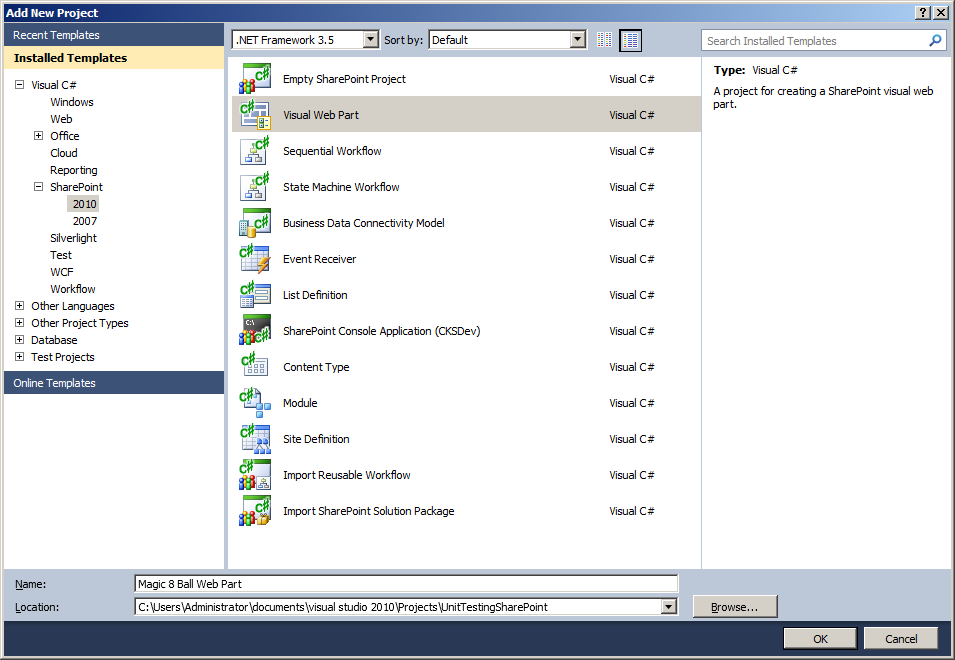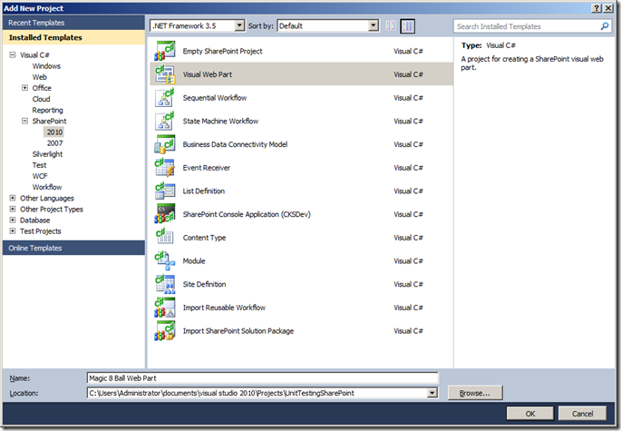 Over the last few parts, we’ve created and tested our Magic8Ball, we’ve extended it to become SharePoint aware and now we just need to wrap it up in a WebPart to finish this piece! For this we’re going to use the new SharePoint visual web part project template and aim to finish with this:-