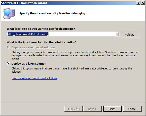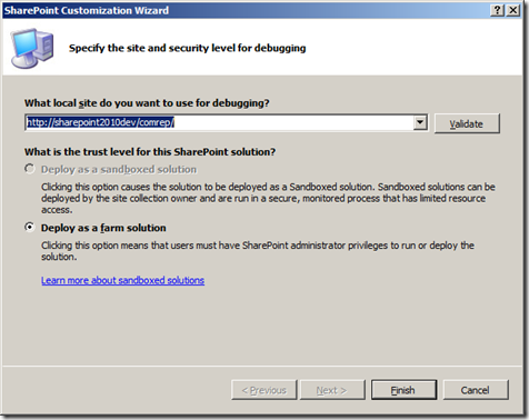 One down side of the visual Web Part project is the fact that we can’t use the Sandbox, so we’ll deploy as a farm solution to our chosen test farm.