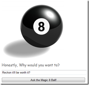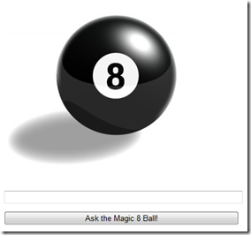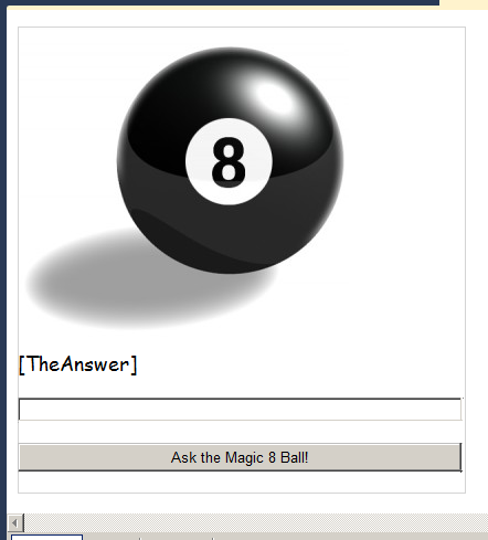 SharePoint8Ball spBall = new SharePoint8Ball("8BallAnswers"); TheAnswer.Text = spBall.AskQuestion(QuestionBox.Text);