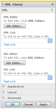 If we add the XML Viewer webpart to a page, choose Edit WebPart properties, you’ll see an XML and an XSLT section.