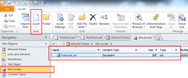 Selcting the Site Assets library brings up the Assets button in the ribbon. Click on the dropdown and choose XML. Then name the file Treestyle.xsl (XSL not XML!)