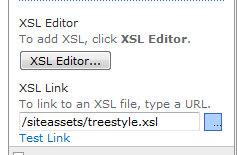 Use the Test Link option in the dialog. If the URL is valid, then IE will prompt you to save the file Treestyle.xsl in which case it’s the contents of the file that are at fault.