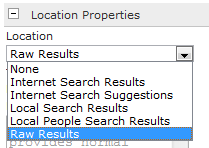 Scroll to the bottom and click on OK. At this point, your new location will not appear right away, I’m assuming that there’s a timer job that processes this in the background, but either way, if we go back to our page with the Search WebPart and re-open the Web part properties, we can now select “Raw Results†as our location.