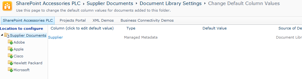 To apply our metadata to our hierarchy, we need to take a look in the library settings and open the Column Default Value Settings page.