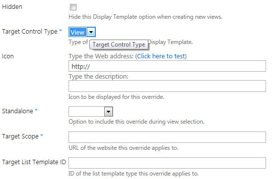 My reason for this is down to the fifth Display Template content type that can be found in the MasterPage Gallery. This is the “JavaScript Display Template” which when selected presents properties in the form that ONLY apply to List View based web parts such as the Target Control Type of List, View or Form and the Target List Template ID.