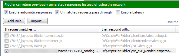 In the example above you’ll notice some greyed out options, in these, I was telling fiddler to replace calls to some of the default client rendering JavaScript files to a local copy of the debug versions of the same that I had copied from the server.