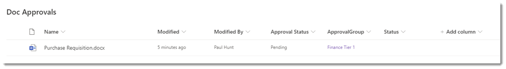 - User submits a completed Document request in a SharePoint library and selects the Approval Group from a drop down.