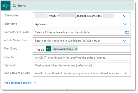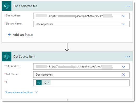 Immediately after, we pick up the selected item using a Get Item action. This gives us access to the file path and other useful info later. The next step then uses a Get Items action to select the correct Approver group from the configuration file list.