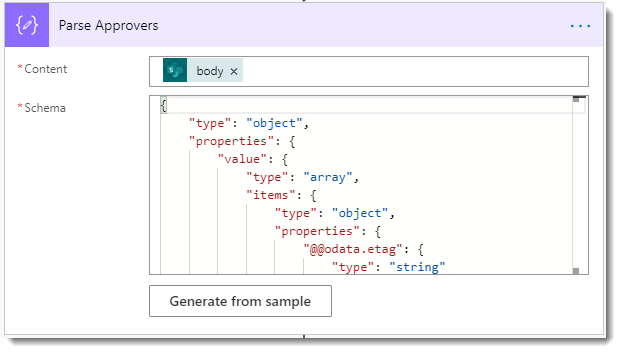 The filter query uses the Title from the lookup field in the source Item to filter the configuration list result. Watch the ‘’ around the dynamic data! (In our sample data above, the Title should equal “Finance Tier 1” or the other group name value. Once we have that item, we just need to parse it using a Parse JSON action to make it useful.