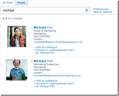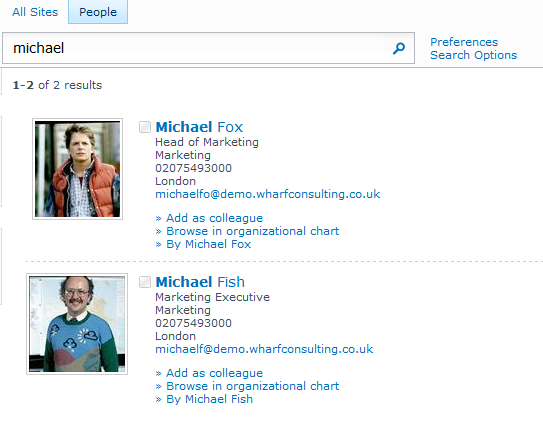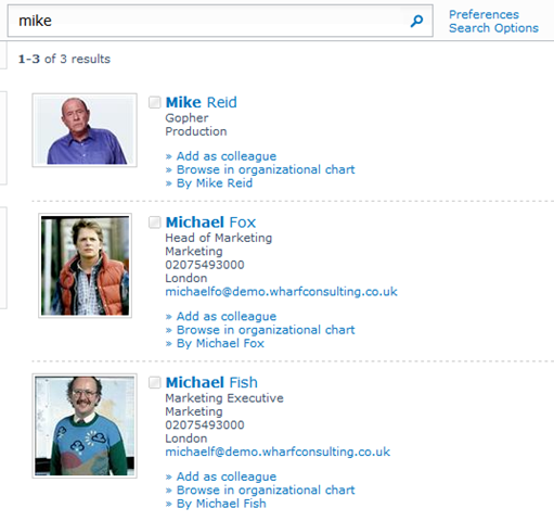Straight away you can see the benefit that either phonetic (Jon, Juan) or nickname searching could be to a large organisation. So lets take a look at our demo site and see what’s happening.