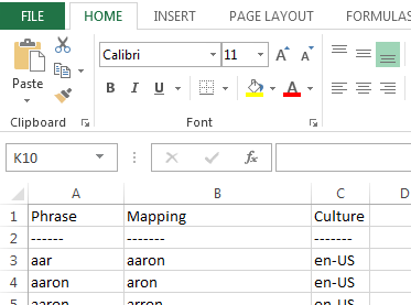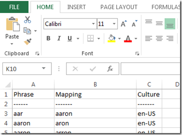 This dumps the en-us entries only into a new text file that we can pull into Excel to create a new CSV file.