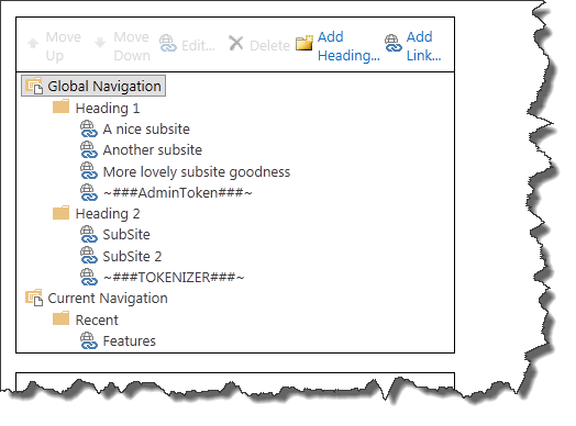 The first thing I did was take a look at the options available to us in the out of the box navigation, Not much has changed to the navigation interface in recent versions of SharePoint apart from the addition of Managed Metadata base navigation now in 2013. For this example, I’m just using the standard Navigation that forms part of the basic site structure, however there’s no real reason why you couldn’t use the same token based system in the Managed metadata.