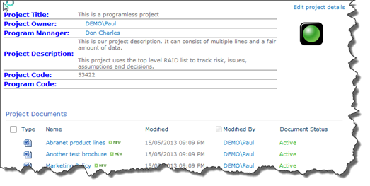 In my example project page, I have 2 list view web parts, the first is a project summary which uses a single list item to display the name of the project, a description, a link to the project manager and the current RAG status. My second web part is a standard list view of the projects document library for which I want to retain full SharePoint behaviour.